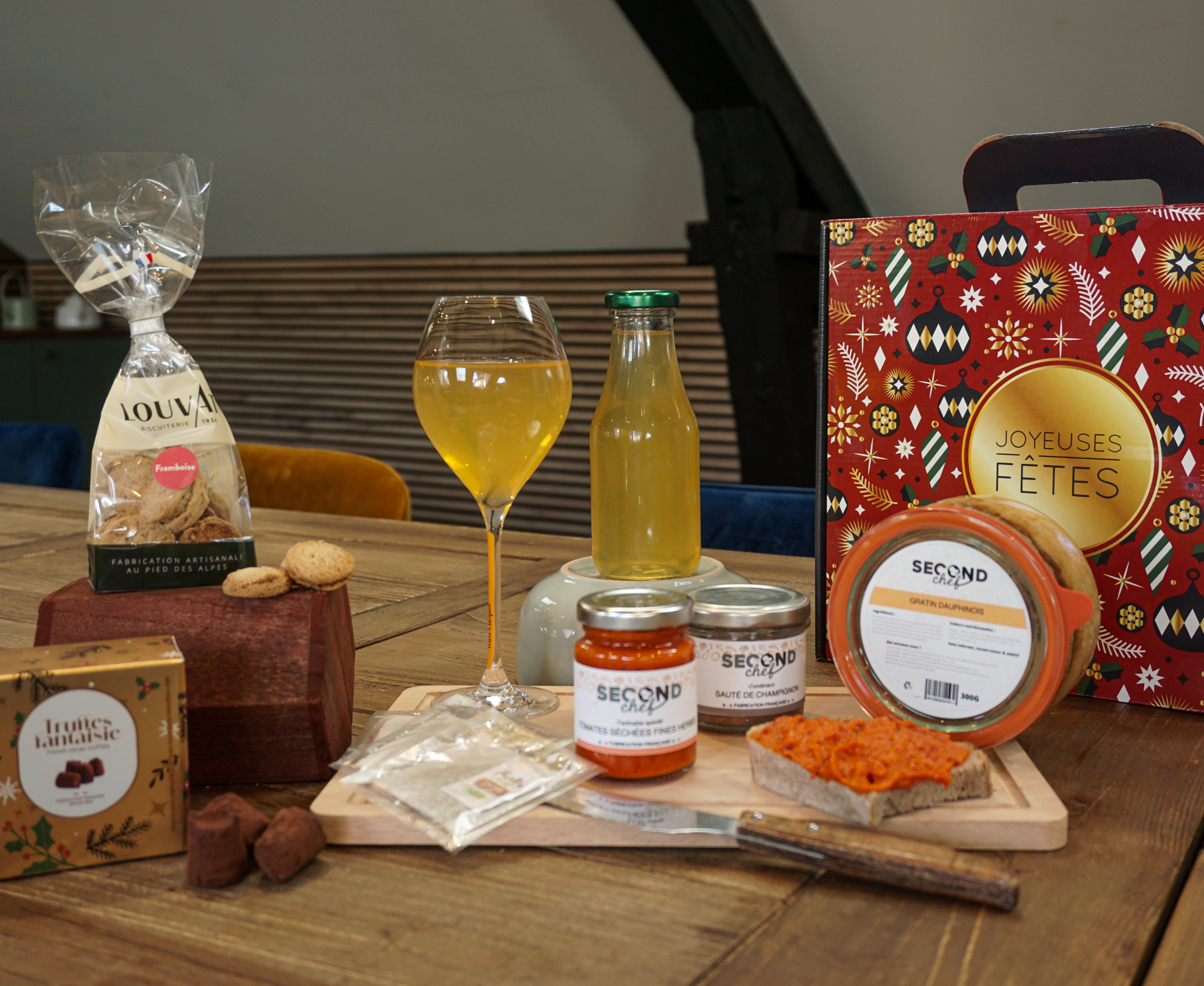 Oubliez le panier garni : ce coffret, c’est un dîner de chef, livré chez vous. Une mise en bouche avec un tartinable tomates séchées et fines herbes, accompagné d’un jus de pomme IsHere qui réveille vos papilles, tout en fraîcheur.